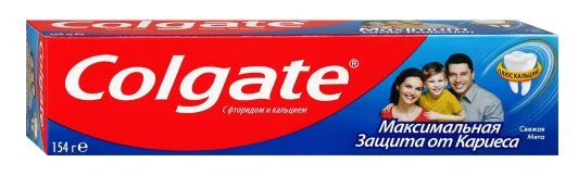 - Зубная паста Colgate «Максимальная защита от кариеса» с жидким кальцием и фтором поможет вам справиться с этой проблемой. Уникальная формула укрепляет эмаль зубов и защищает зубы со всех сторон, проникая даже в труднодоступные места полости рта. Зубная паста обеспечивает ощущение свежести на длительное время.