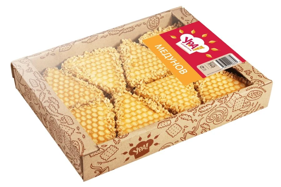мука пшеничная высший сорт, начинка «Классика со вкусом сгущенки вареной» (сахар, вода питьевая, пальмовое масло рафинированное дезодорированное, молоко сухое обезжиренное, сыворотка сухая молочная, стабилизаторы: Е1442, пектин, цитрат натрия; консервант- сорбат калия, соль пищевая, ароматизатор «Сливки»), сахар, арахис жаренный дроблёный, вода питьевая, растительное масло пальмовое, продукт яичный сухой (меланж), молоко сухое обезжиренное, соль пищевая, разрыхлители: гидрокарбонат натрия (сода пищевая), гидрокарбонат аммония; ароматизатор «Мед», регулятор кислотности-лимонная кислота