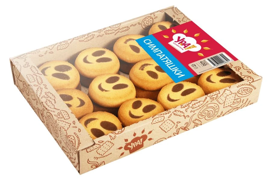 - Нежное сдобное печенье из муки высшего сорта с аппетитным ванильным ароматом. Особенно вкусным оно получается за счет умеренной сладости и рассыпчатой текстуры. Забавный рисунок из шоколадного теста в виде смайлика делает чаепитие веселым и легким.
