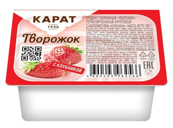 Творожок с клубникой 9% 100 г Карат