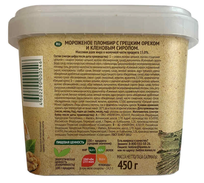 1 – сливки, молоко цельное, молоко цельное сгущенное с сахаром (молоко цельное, молоко обезжиренное, сахар), наполнитель «Кленовый сироп» (вода, сахар, патока кукурузная, кленовый сироп, стабилизаторы: дикрахмалфосфат оксипропилированный, пектины, соль, ароматизатор, карамельный сироп, консерванты: сорбат калия, бензоат натрия), вода, сахар, ядра грецкого ореха обжаренные дробленые карамелизованные (ядра грецкого ореха обжаренные, сахар), яичный меланж, молоко сухое обезжиренное, сироп сухой глюкозный, желатин, краситель Е150d, ароматизатор «Грецкий орех»;