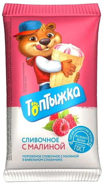 - Мороженое "Топтыжка" с малиной в вафельном стаканчике — это нежное сливочное мороженое с ярким вкусом малины. Изготавливается из натурального молока и ягодного наполнителя "Малина", без заменителя молочного жира.