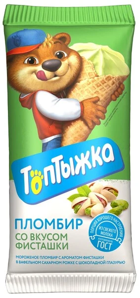 - Фисташковый пломбир «Топтыжка» в вафельном сахарном рожке, покрытом шоколадной глазурью, – это любовь сладкоежек. Изготавливается из натурального свежего молока с добавлением натуральной фисташковой пасты, что придает мороженому насыщенный фисташковый вкус. Изготавливается из цельного молока, без заменителей молочного жира. Мороженое «Топтыжка» — продукция высокого качества с гарантией от производителя. Произведено в соответствии с ГОСТ.