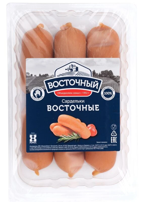 свинина, вода питьевая, мясо цыпленка-бройлера, баки свиные, соевый белок, кожа куриная, жир говяжий, крахмал картофельный, соль поваренная пищевая, соль пищевая выварочная нитритная (соль пищевая, агенты антислеживающие (Е535, Е500), фиксатор окраски Е250), стабилизаторы (Е450, Е466, Е407, Е412, Е452ii), специи, экстракты специй, декстроза, усилитель вкуса Е621, антиокислитель Е300, сахар белый, регуляторы кислотности (Е331, Е451i), мальтодекстрин, чеснок сушеный, краситель Е120. Продукт может содержать следы горчицы, злаков, содержащих глютен, кунжута, молока, орехов, сельдерея, яиц