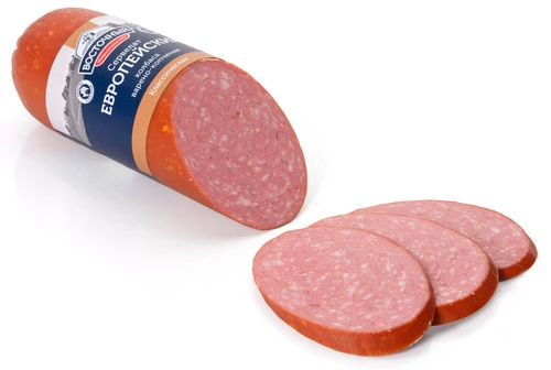 свинина, вода питьевая, мясо цыпленка-бройлера, мясо птицы механической обвалки, свиная шкурка, соль, загуститель Е401, жир говяжий, декстроза, сыворотка сухая молочная, стабилизаторы (Е452i, Е331i, Е450iii, Е452ii), смесь посолочно-нитритная (соль, фиксатор окраски Е250), регулятор кислотности Е451i, усилитель вкуса и аромата Е621, антиокислители (Е300, Е316), экстракты пряностей (перец черный, мускатный орех), ароматизаторы, молочные белки, пищевые волокна (пшеничные), сахар белый, гемоглобин (свиной), краситель Е120. Продукт может содержать следы горчицы, злаков, содержащих глютен, кунжута,